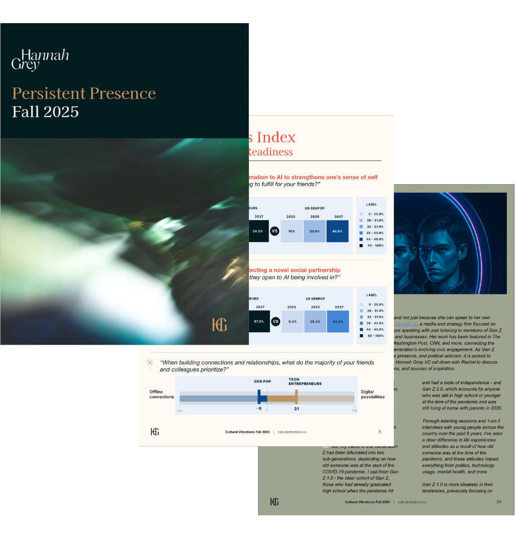 We are obsessed with how ideas, trends, and technological advancements manifest across culture. Our proprietary Vibrations AI-OS tracks thousands of live signals, from surfacing friction to nascent tech catalysts, identifying critical shifts before they become mainstream.